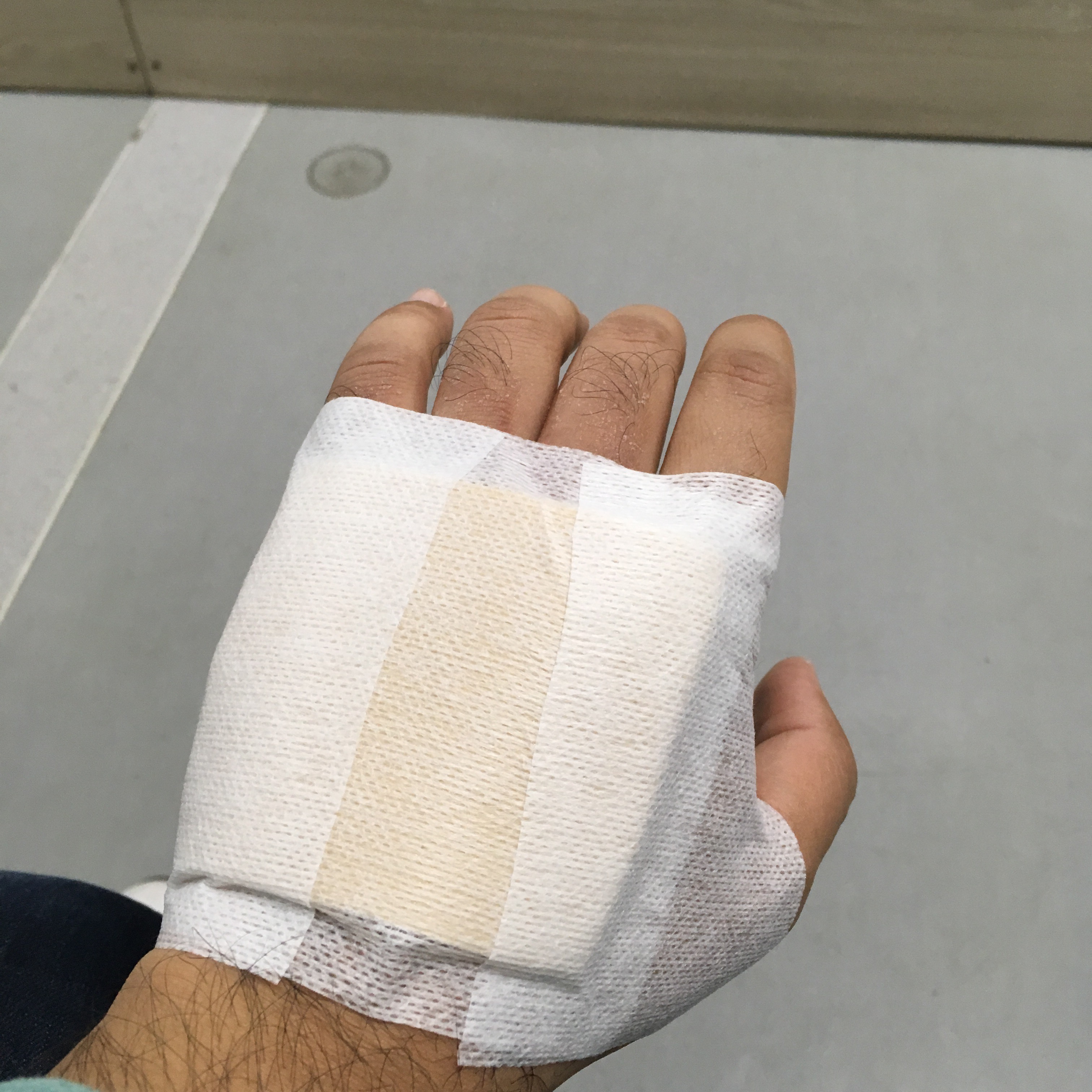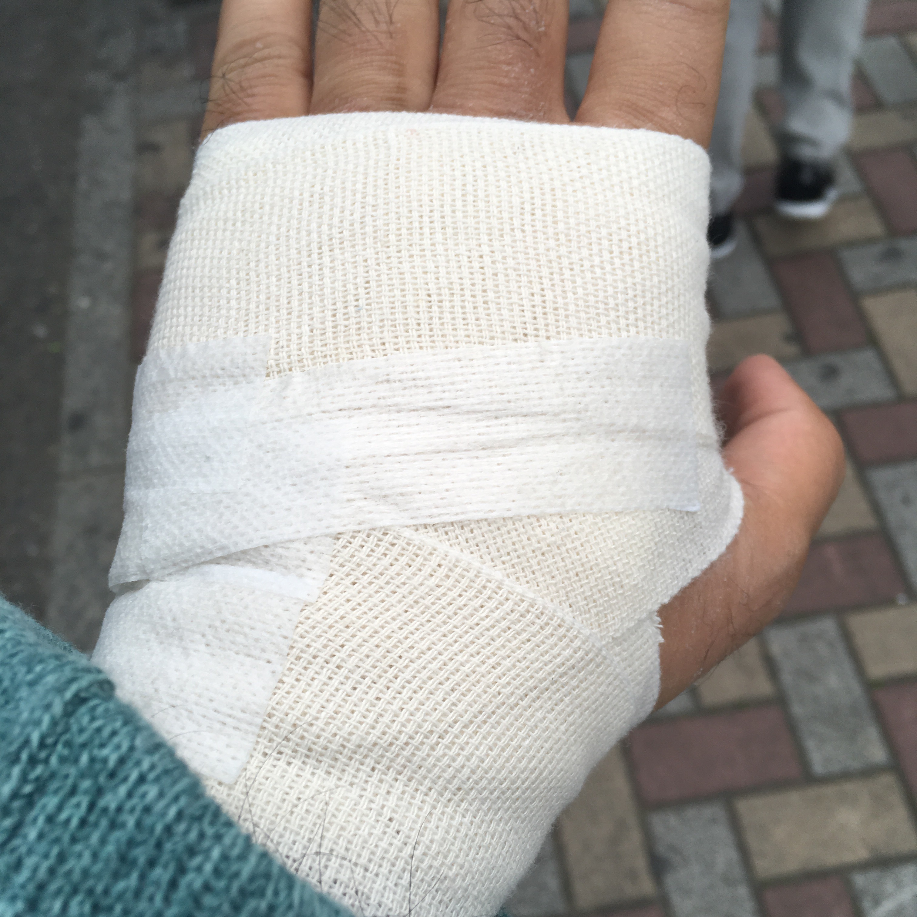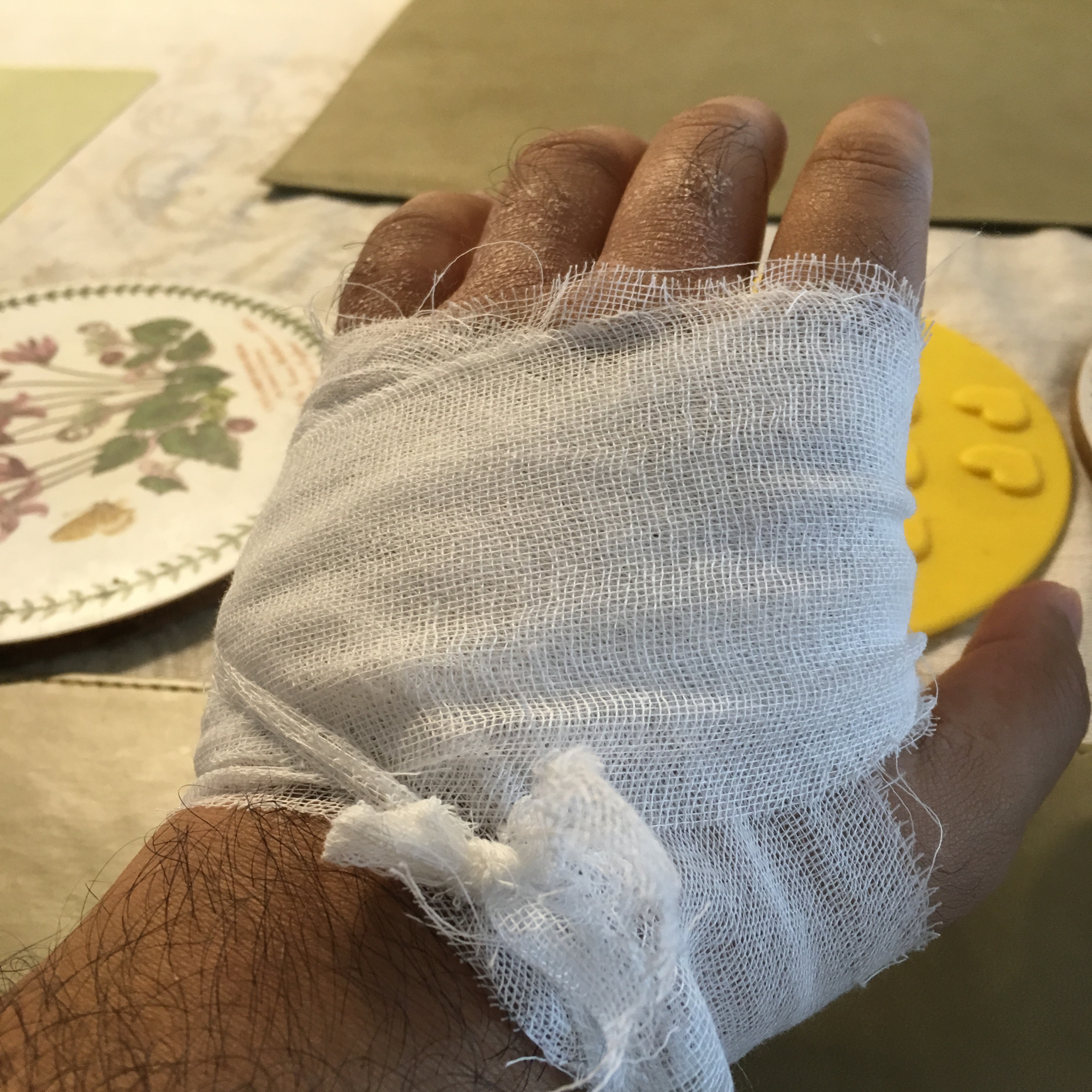 Here’s what my hand looked like with a homemade bandage: